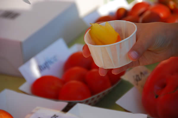 On Saturday, August 25, we held our annual Tomato Tasting, for the sixth straight year. With over 30 different tomato varieties available for tasting, there was a truly spectacular array of shapes, sizes, colors, and of course, flavors. Douglas Katz, from Fire Food and Drink, joined us to demonstrate some simple, elegant ways to bring out the best in the season's best. Check out his recipe for chimmichurri, a wonderful companion for fresh tomatoes, and photos from the day, below.
